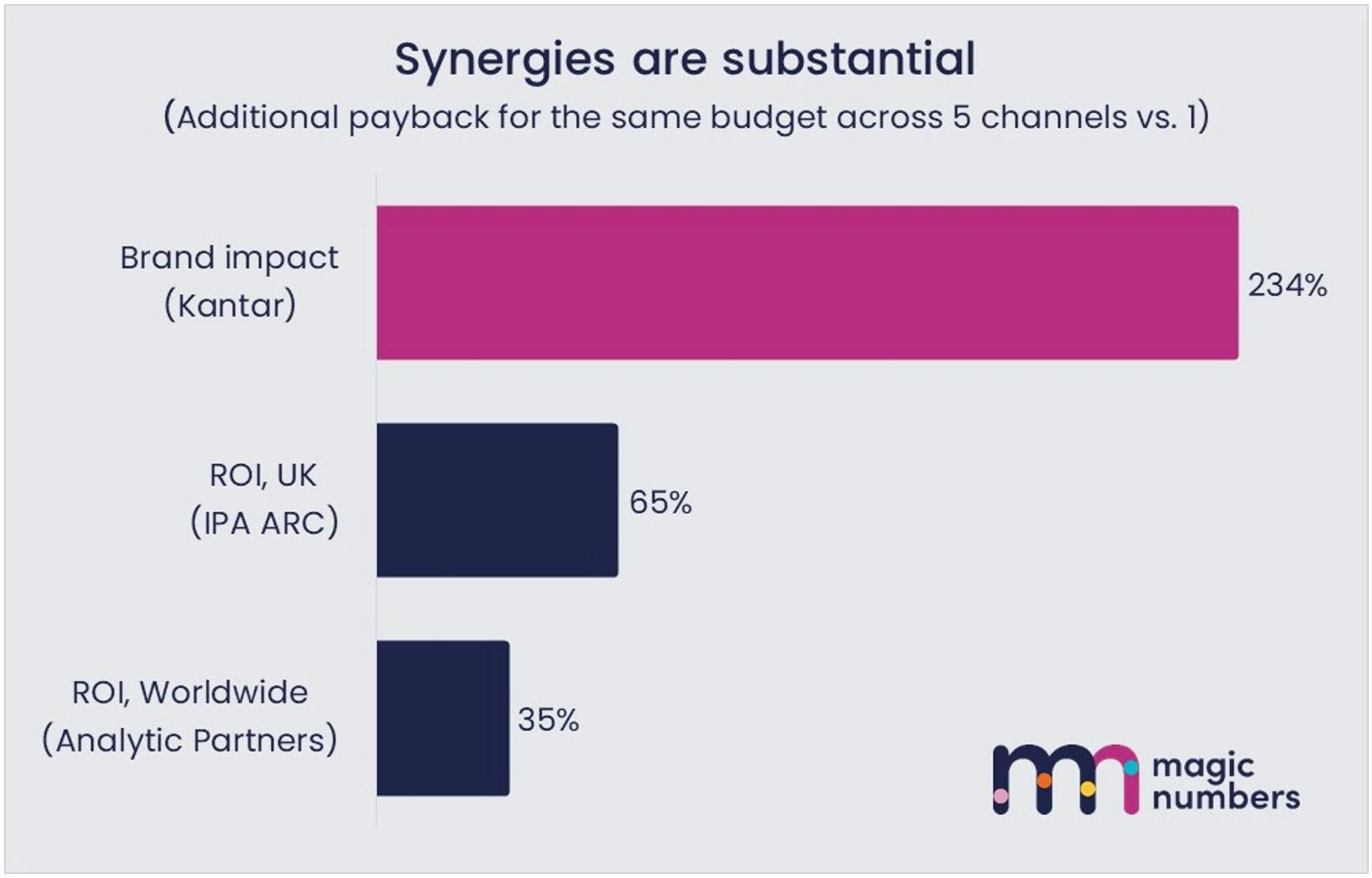 The chart below plots the size of these effects as you go from using one channel to five. Econometrics reports a huge 35-65% more ROI. And, according to Kantar, you can more than double the effect on your brand.