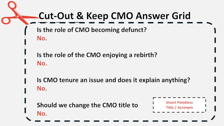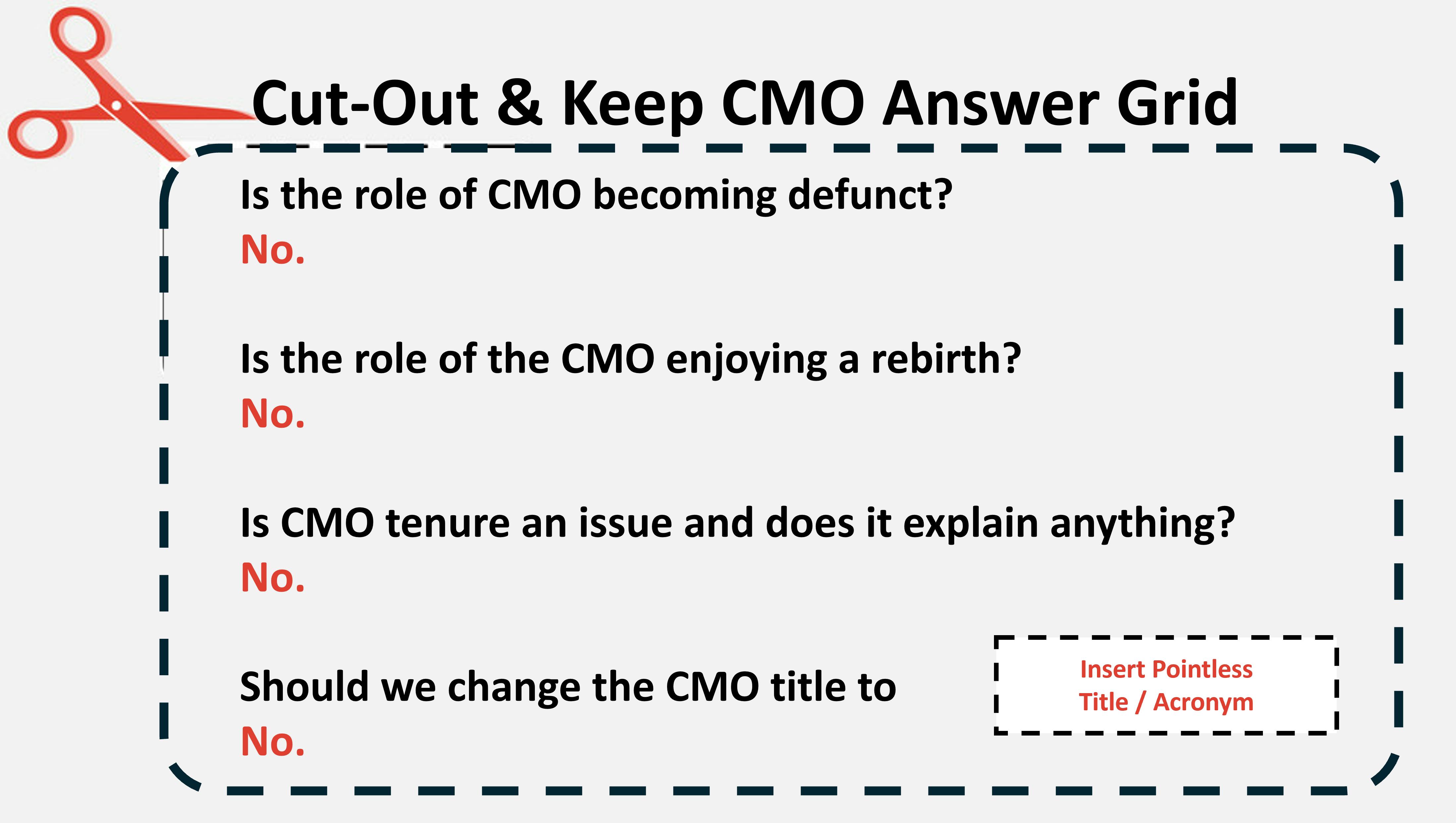 I might just be able to save us all hundreds of painful, pointless hours of future CMO discussion bullshit. Please see my helpful Cut-Out & Keep CMO Answer Grid below. Put it in your wallet or purse. Should you find yourself at a conference where these topics come up, or are approached by a colleague wanting to debate them over a pint, pull it out and staple it to them and then walk swiftly away.