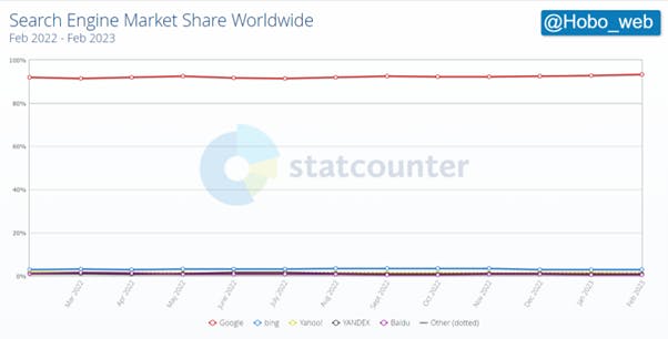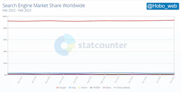There is one fascinating place where ChatGPT is having an immediate and immense impact on business. And that is in the world of search. The most boring chart of all time is the one that shows the market share for search. Over the past decade there has been an indomitable blue line hovering around the 90th percentile and running with an unerring horizontal trajectory across every quarter, every year. It’s the line representing Google’s share.