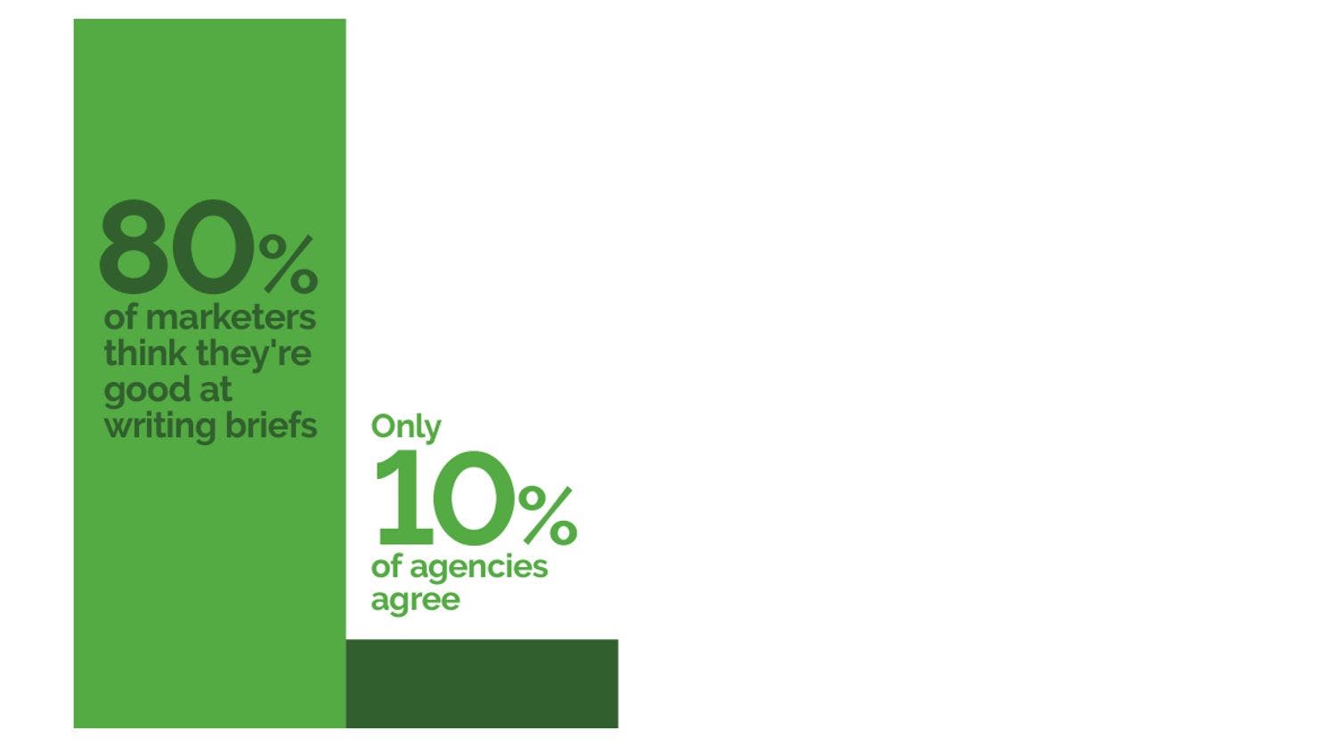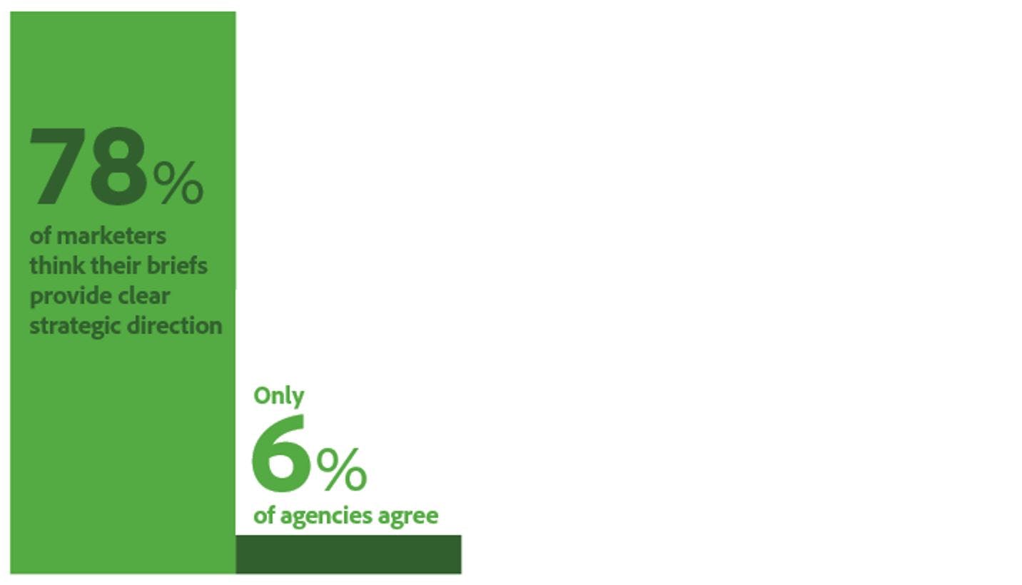 And it’s not just that bad briefs are a key issue for marketers, it’s that marketers don’t think they are a key issue. The killer chart is the one showing most marketers reporting their briefing skills as good and most agencies, on the receiving end of these briefs, thinking the exact opposite. It’s one thing to be bad in the sack. It’s quite another to be bad in the sack and think you are Casanova. Specifically, you’ll never improve or seek advice on improvement while that misplaced confidence remains.