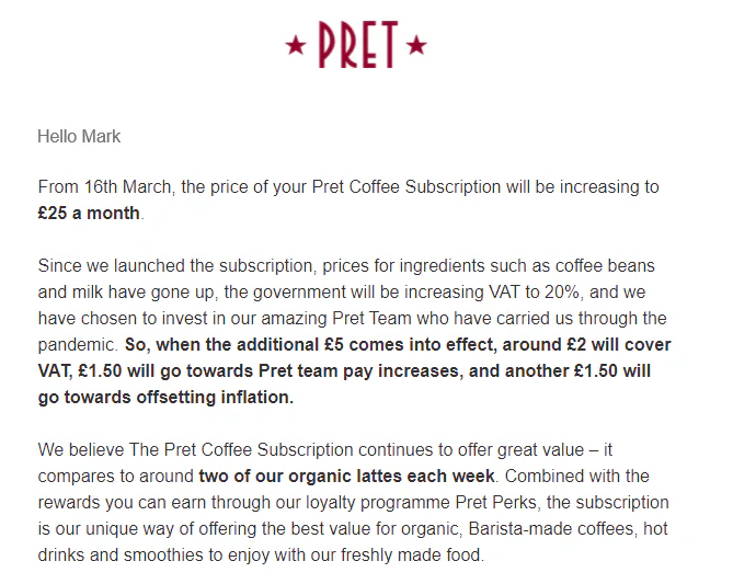 When Pret-a-Manger launched its coffee subscription last year, many customers could not believe that £20 a month enabled them to effectively drink as much coffee as they wanted at almost any Pret location. But, like almost every other British company, Pret is now staring at significant cost increases that render its original subscription pricing unprofitable. So, the company emailed its current coffee subscribers to notify them of an increase in price (see image above).