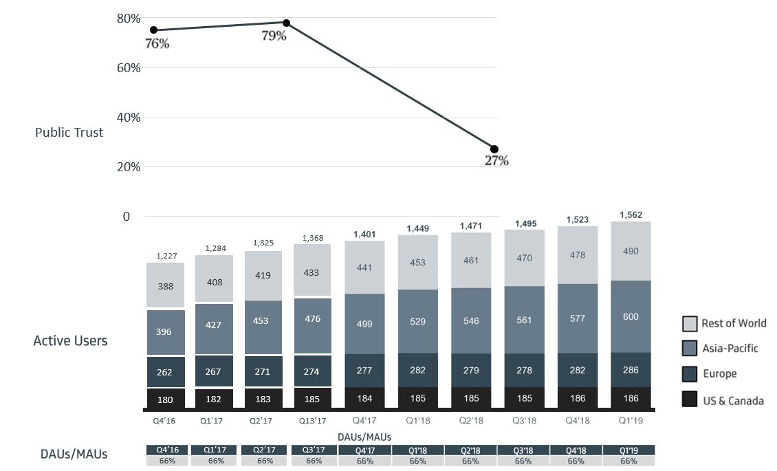 Except none of that has happened. In fact, the opposite has occurred. Across the murky, smoke-filled decade that has surrounded Facebook, two clear facts emerge. First, that the company has low levels of public trust that have consistently declined in more recent years. Second, that same company has grown its commercial base on every possible level over the same period. Penetration is up, revenue is up, profit is up, share price is up.