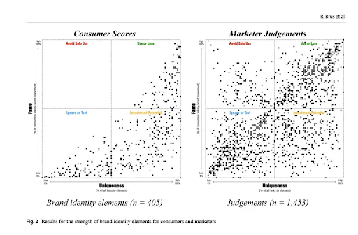 Chief among those risks is the one where marketers believe that lots of things count when they really don’t. The graph below from Ehrenberg-Bass shows how terrible marketers are at judging their own work. It compares consumers’ judgment about what brand assets are famous and unique, with marketers’.