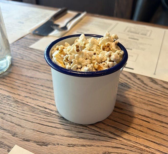 No sooner are we seated than a cheerful waiter brings over a cup of free popcorn along with our menus. We’ll chomp through this as we choose, with a general sense of warmth towards the place.