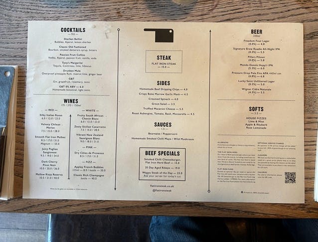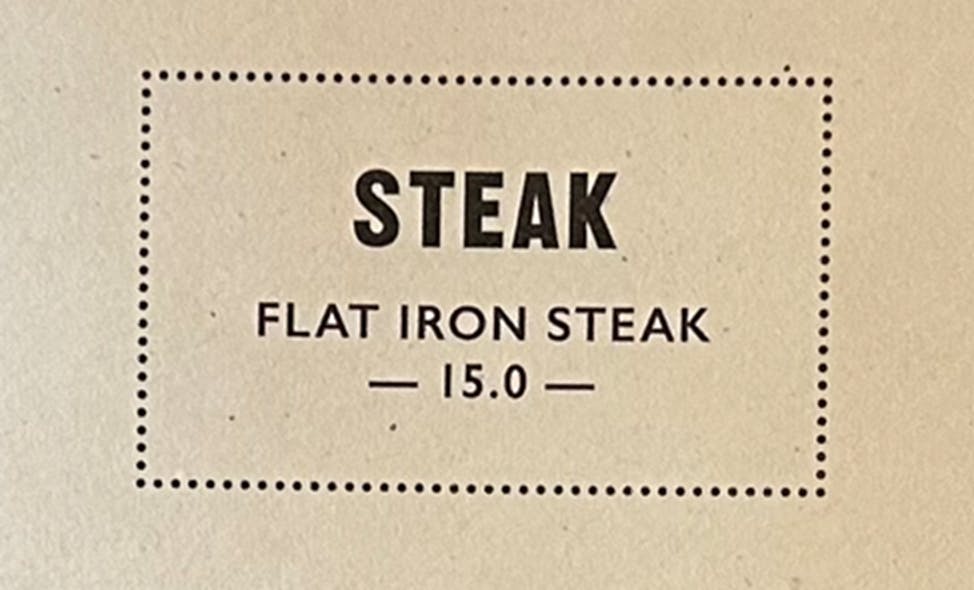 One of the first things that strikes us is how very brief it is. Food down the middle, drinks on the sides, and just one page. It takes just a moment to decide that, yes, we’ll have the flat iron steak please.