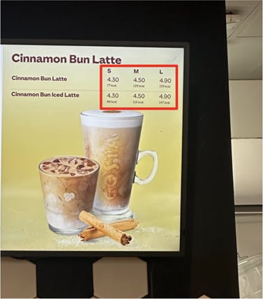 Costa’s sign is using another tactic too, by making it clear that upgrading to a large drink will cost an extra 35p. This taps into a bias known as differential price framing, which describes the phenomenon that higher priced items are more appealing when the differential price is shown rather than the cost (which, in this case, would be £5.34).