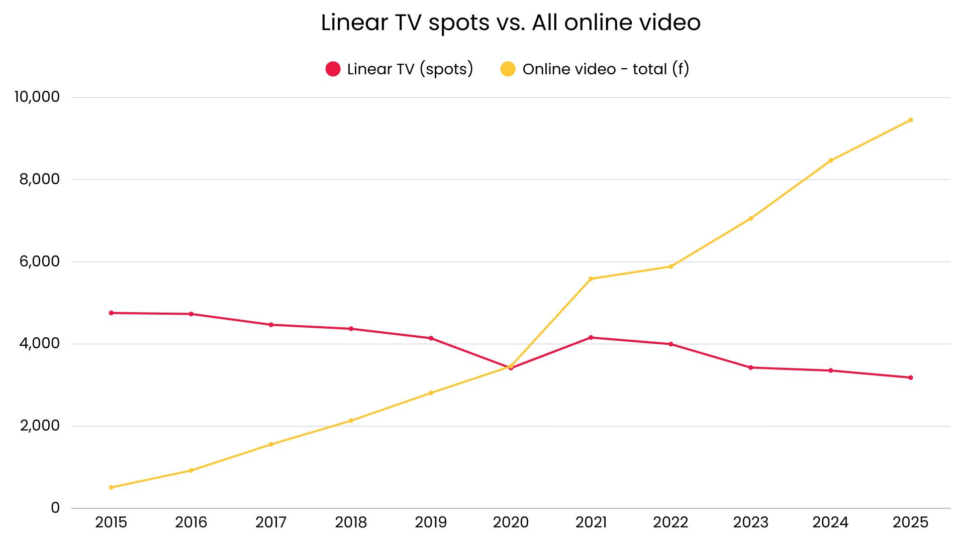 Since 2015, linear TV ad spend has dropped by an average of 33.1% year-on-year, according to figures from Warc. In contrast, total online video – including BVOD, SVOD, social media and open web video – has grown 1,759.4% over the same period, demonstrating that digital investment is increasingly significant, even for traditional broadcasters.