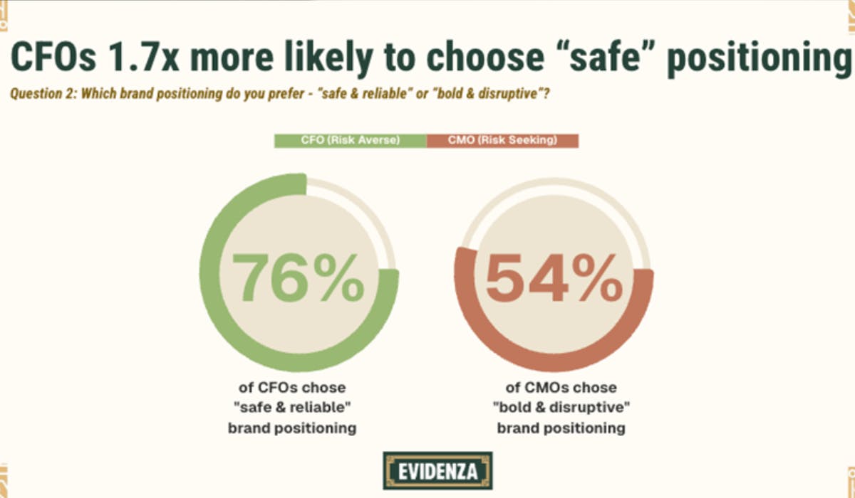 Evidenza.ai, the company we founded, recently ran a synthetic survey to 500 AI-generated CMOs and 500 AI-generated CFOs. When we asked about attitudes towards risk, the results were startling. When asked whether brands should pursue ‘safe and reliable’ versus ‘bold and disruptive’ positioning, 76% of CFOs chose safe and reliable. Meanwhile, 54% of CMOs opted for bold and disruptive. Safe and reliable doesn’t win you a Cannes Lions, after all.