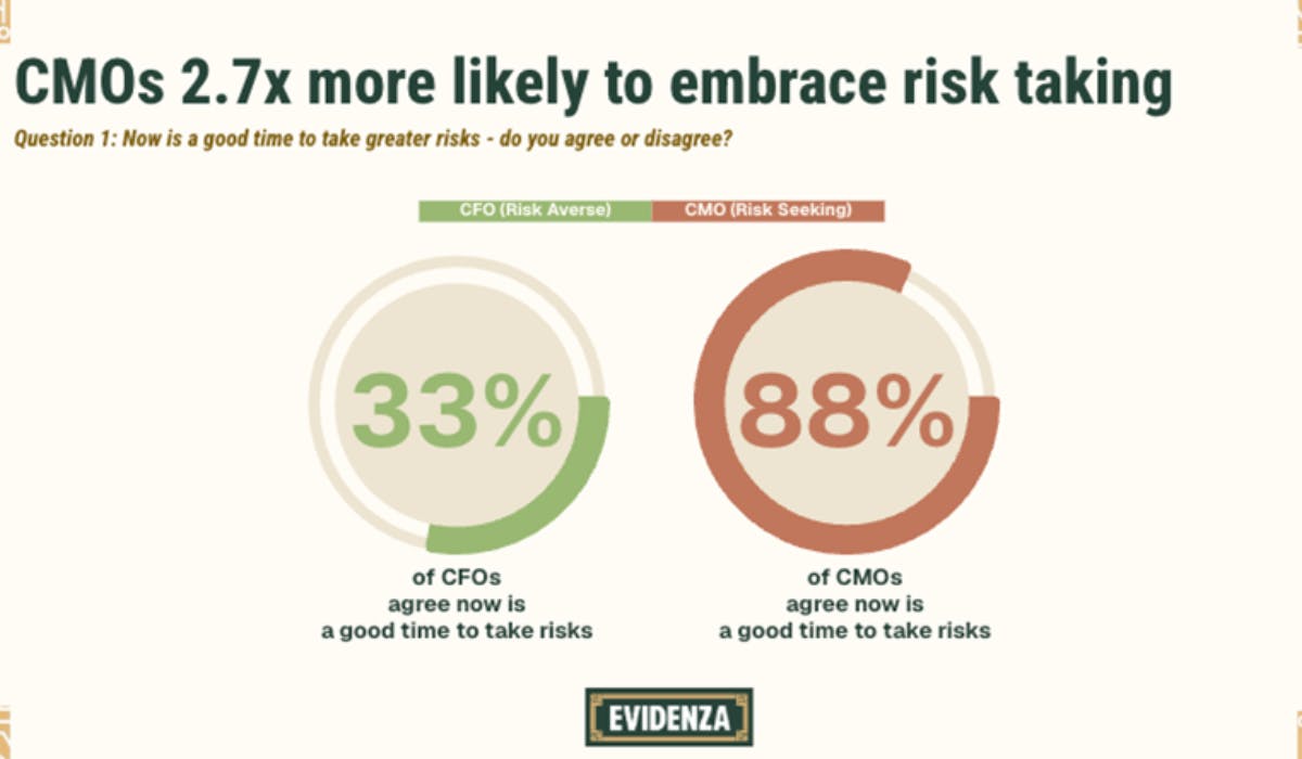 The gulf widens from there. When asked if now is a good time to take greater risks, only 33% of CFOs agreed, while a whopping 88% of CMOs said yes.
