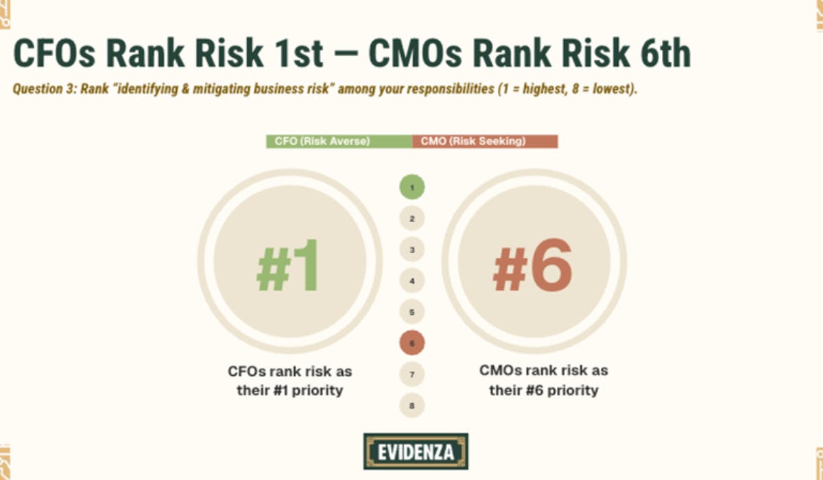 Most tellingly, when asked where ‘identifying and mitigating business risk’ ranks among their responsibilities, CFOs placed it at number one. CMOs? Number six. Risk is not even on the CMO radar.