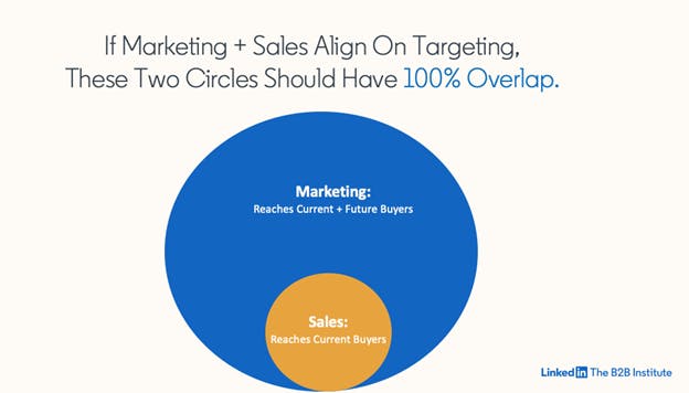 - Marketing needs to target broadly to increase alignment. The primary reason that marketing and sales are so misaligned is because at most B2B companies both departments pursue a hyper-targeting strategy. The small coverage of the sales and marketing circles dramatically decreases the likelihood of overlap. Because marketing is the only department that can feasibly reach every buyer in the category with the press of a button, marketing should lead the way in adopting broader targeting. The benefits of broader targeting are clear for sales and marketing and finance. Going broad doesn’t mean reaching everyone – it means reaching anyone who could buy the category, which in B2B is still a relatively small audience. Targeting the category isn’t wasteful, it’s impactful.