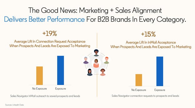 Our data shows that when sellers reach out to buyers who have been exposed to marketing within the last 30 days, buyers are much more likely to respond. On average, B2B buyers are 19% more likely to accept a connection request from sales, and 15% more likely to open an inMail message from sales, after seeing marketing content.
