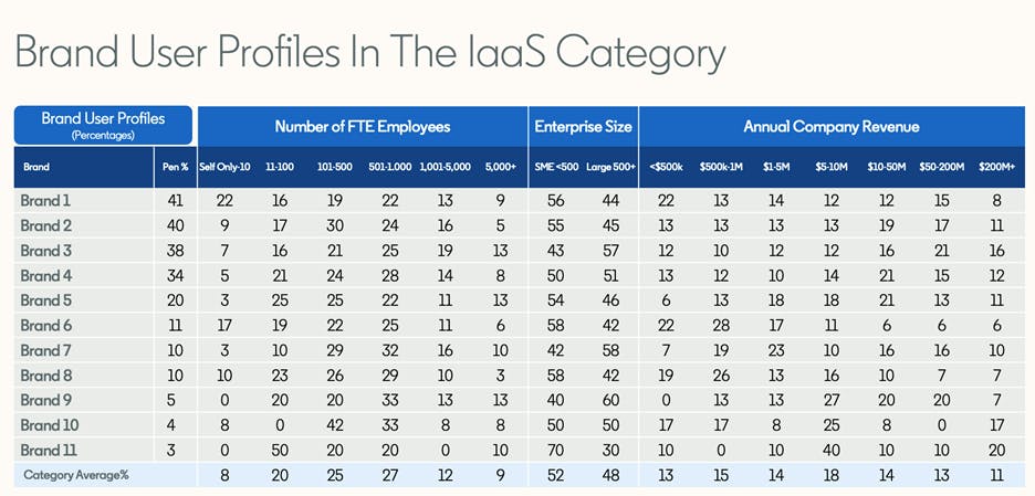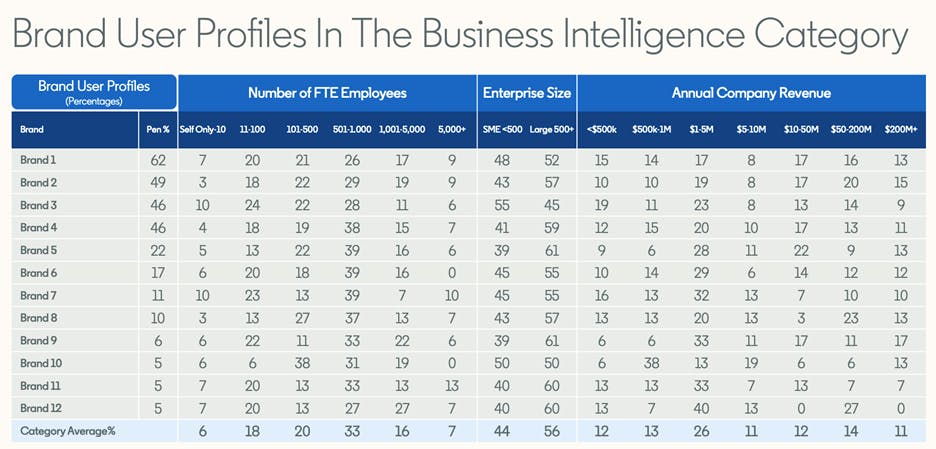 As you can see in the above table, business intelligence brands vary significantly in terms of their penetration, from as low as 5% to as high as 62%. That’s a big, meaningful difference (by a factor of 12). But on all other variables, their customer bases look remarkably similar. For example, for all brands, the proportion of their customers who have 501 to 1,000 employees is about 33%, and the amount with revenue of $10m to $50m is about 12%, with very few deviations.