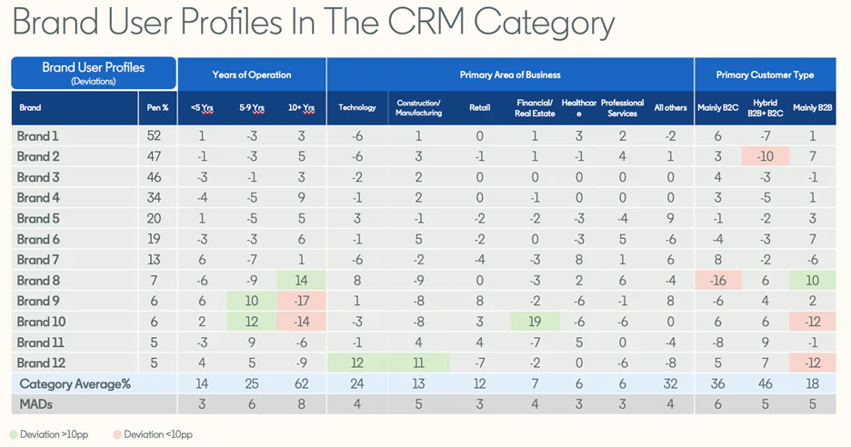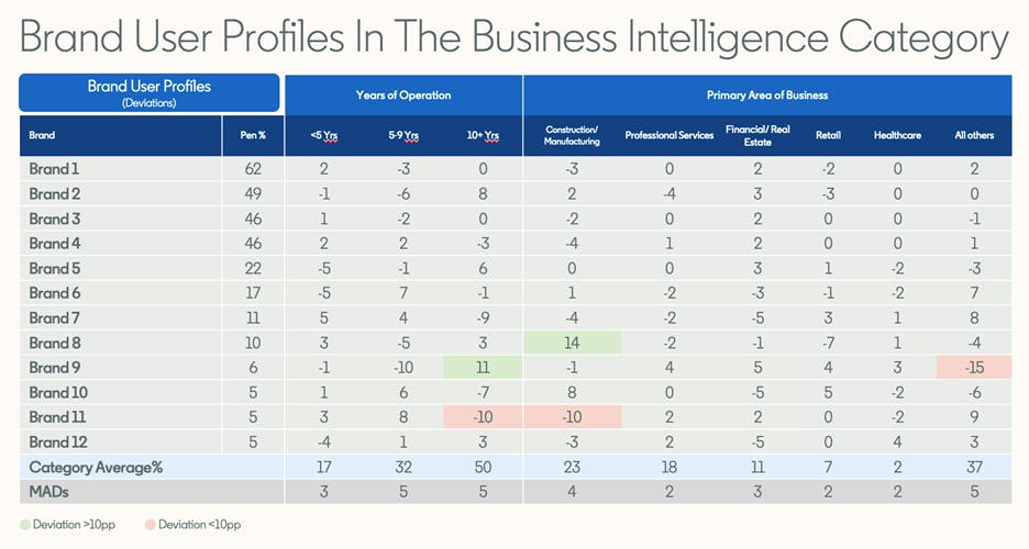You can cut the data by industry vertical and observe the same exact pattern. The below data highlights ‘mean absolute deviations’ (MADs) by vertical and business maturity. For example, on average, for the professional services segment, BI brands only differ by around 2 percentage points from the category profile. Deviations above 10 points are highlighted in red and green.