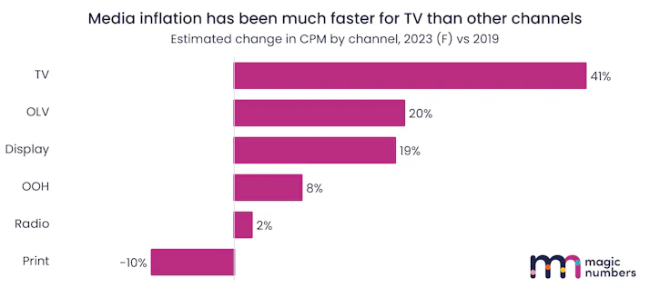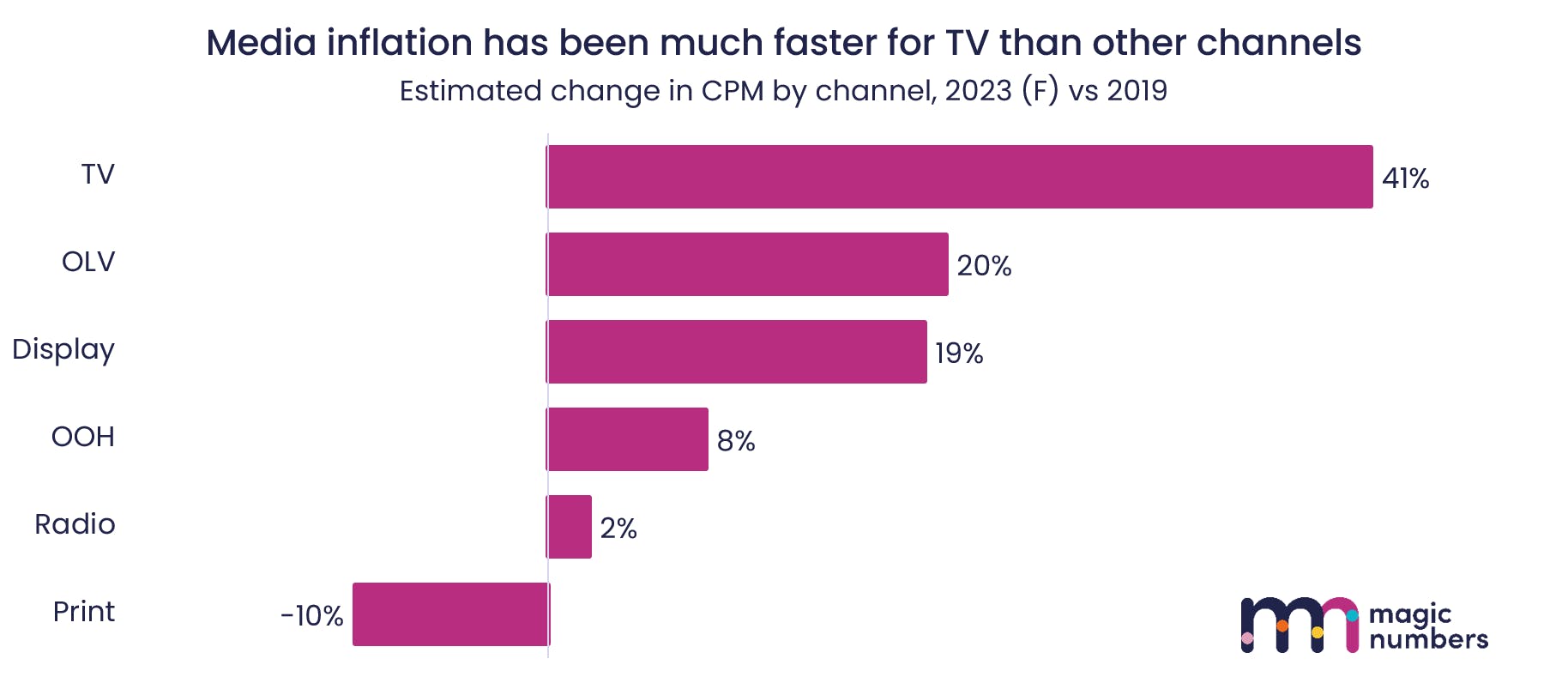 This article has also been updated to incorporate ECI’s latest estimates of inflation as at Q3 2023. Previous data put the cost of a thousand watches of a TV ad up by 50% since 2019, while online video was up by 20%, display (18%), OOH (6%), radio (1%), print (-10%).