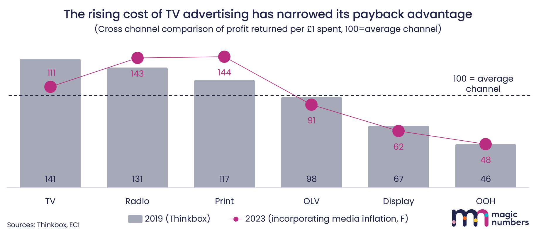 In the chart below, the grey bars show the old story. Pre-Covid, TV beat the average profit ROI by c.40%. But, in the pink line which incorporates media inflation since 2019, TV’s payback is now only c.10% above the average channel.