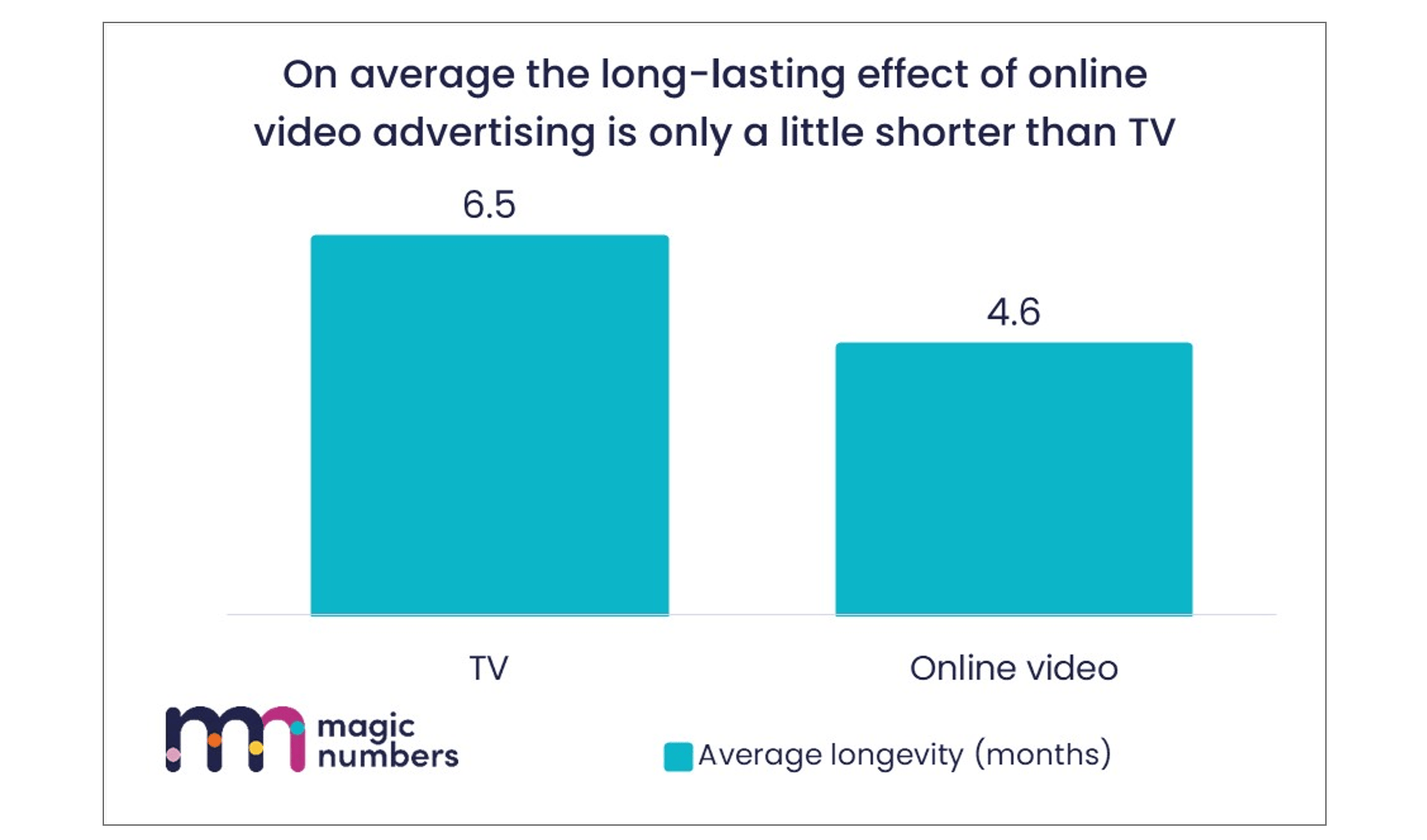 Online video is much more viable as an alternative. Its long-lasting effect is only a little less than TV’s, coming in at an average 4.6 months of increased sales after airing versus 6.5 months for TV, according to data from Magic Numbers, D2D, Ekimetrics, Circana, OMG, and VCCP media via IPA ARC.