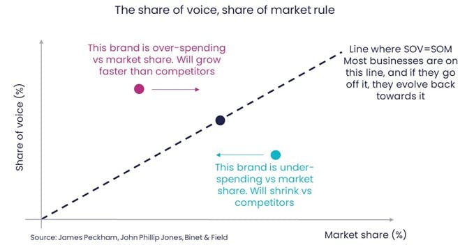 With help from her insight team, we worked with her to carry out share of market, share of voice analysis using a free tool we have created (forgive the plug). It takes budget plans you put in and scenarios for what competitors might do and uses the share of voice, share of market rule pictured below, to predict your likely market share next year.