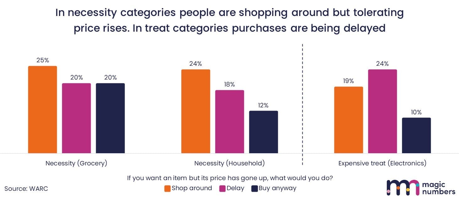 The chart below, from Warc’s recent trends survey, shows that in these categories, the response to price rises isn’t to delay or forget the purchase, but to shop around. That means customers who have always come to these purchases on autopilot – buying the same thing they always did – are, for once, winnable in 2024.