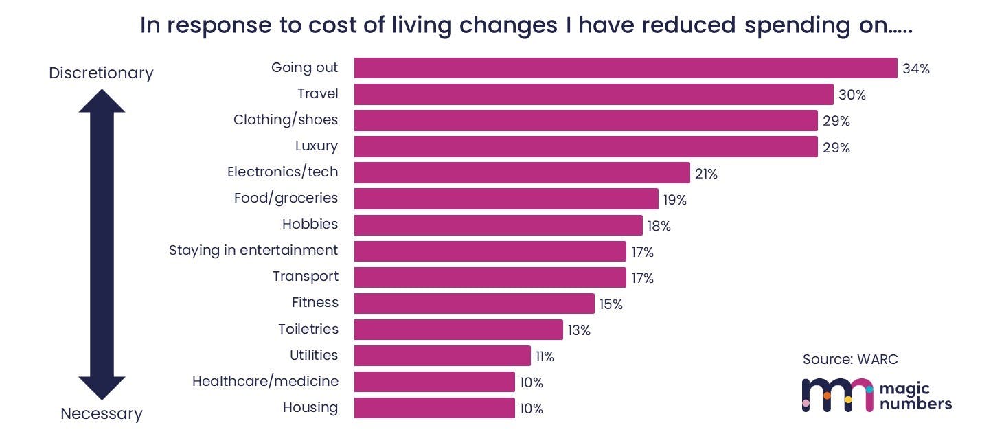 The chart above, again taken from the Warc study, gives a hint of which advertising sectors are most likely to be affected. It shows the percentage of people who have already reduced spending on each category in response to rising prices.