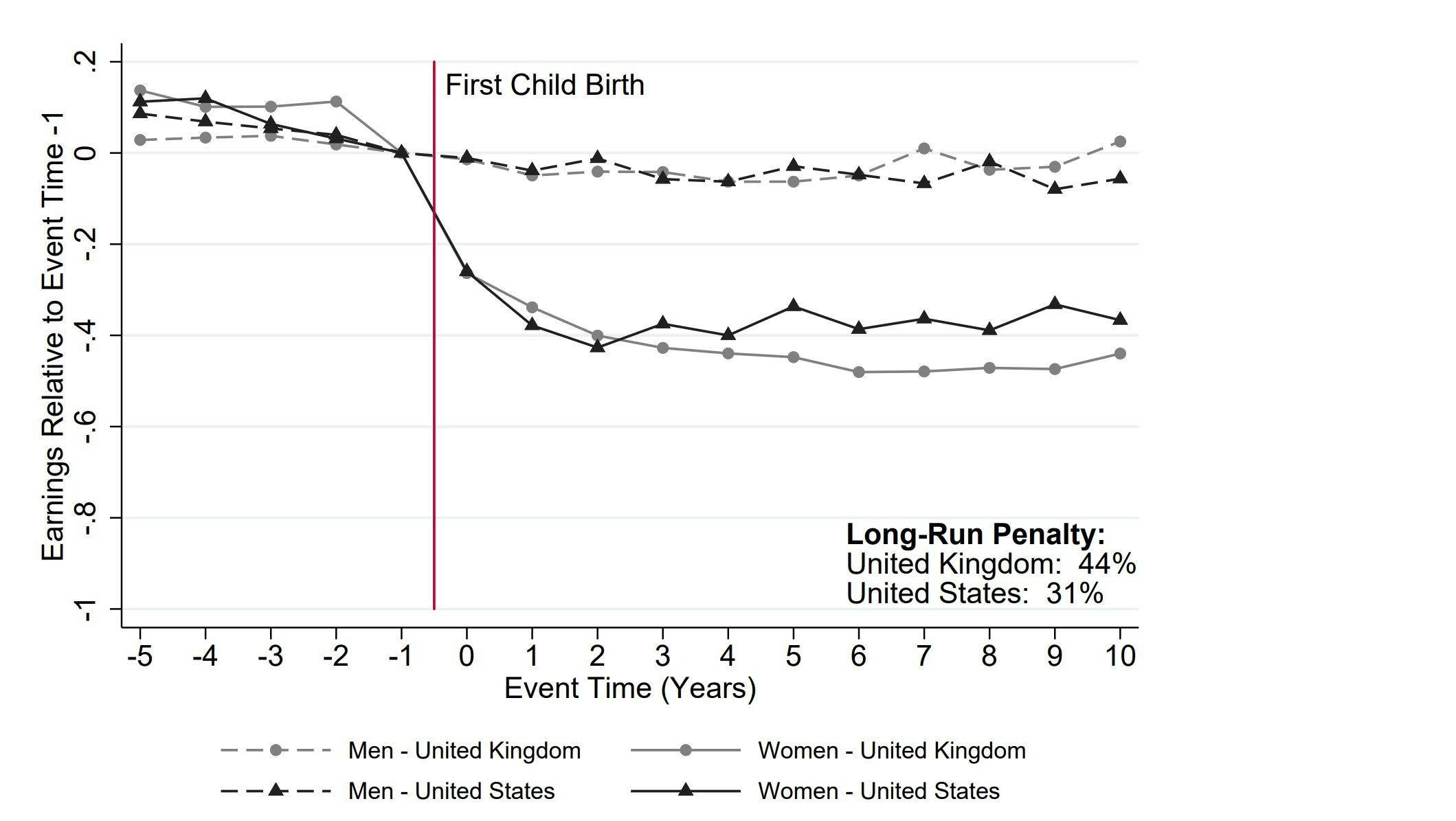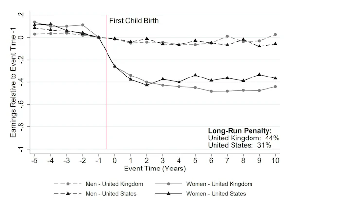 The chart below is from a study carried out by economists from Princeton and the LSE. It shows how earnings change after having the first child, separately for men and women, for the UK in grey and the US in black.
