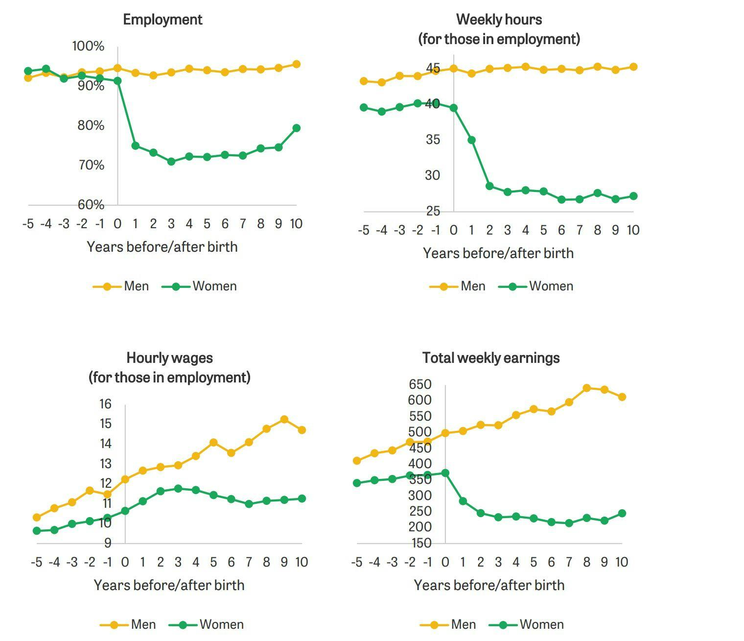 Many women, immediately after having a child, either give up their job or cut the number of hours they work – shown in the top two panels. This has an obvious and immediate effect on their earnings in the bottom right panel.