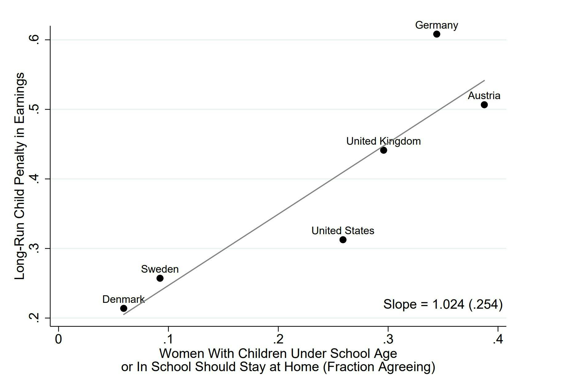 On the y-axis is what the authors call the ‘child penalty’ for women, how much lower women’s earnings are versus men’s 10 years after having the first child. The x-axis is answers to attitude surveys in each of the countries.