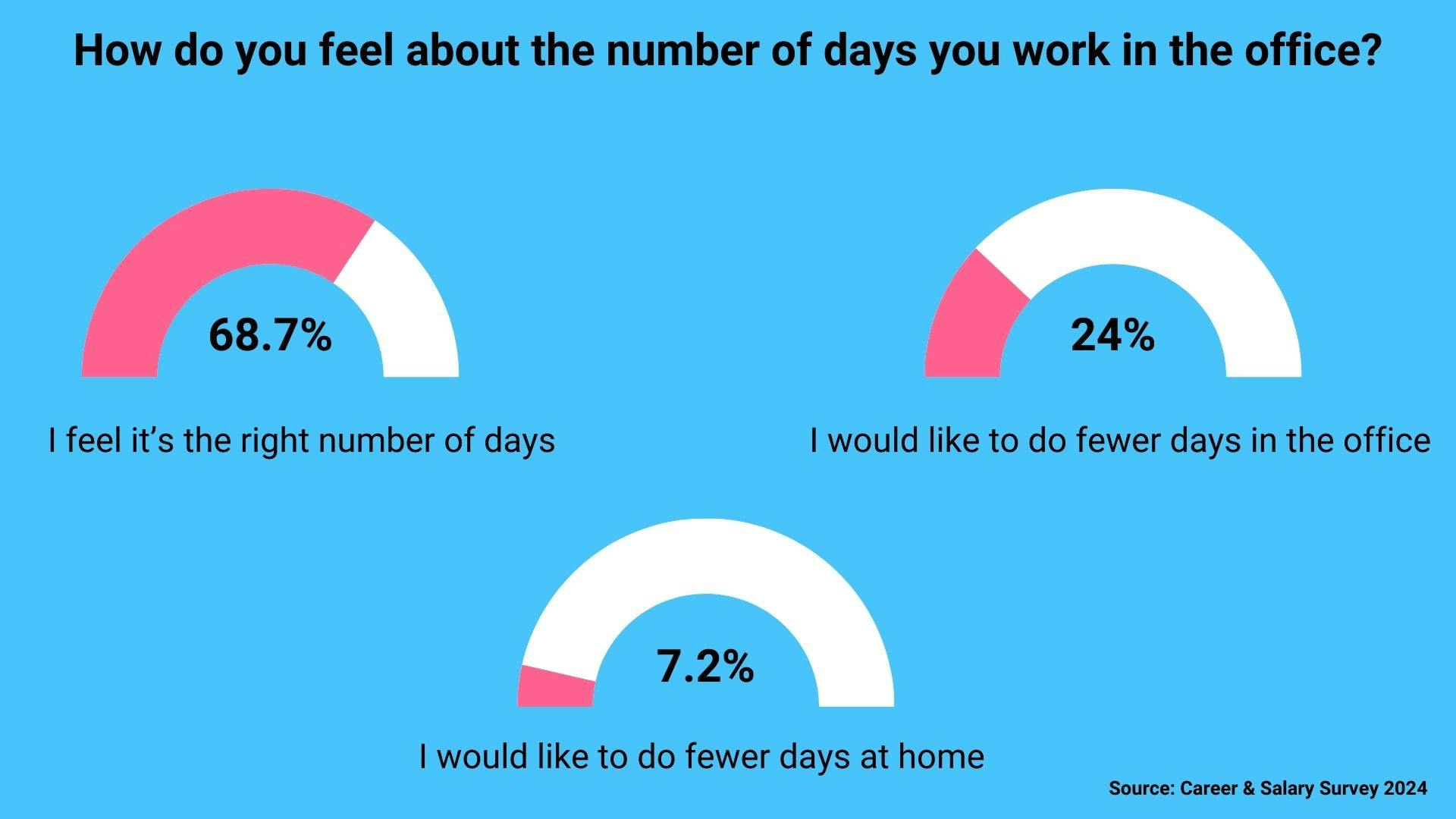The average hybrid week is welcomed by most marketers with over two-thirds (68.7%) saying they believe the number of days they work in the office currently is the right amount. Nearly a quarter (24%) would like to do fewer days in the office and even fewer still (7.2%) want to work from the office more.
