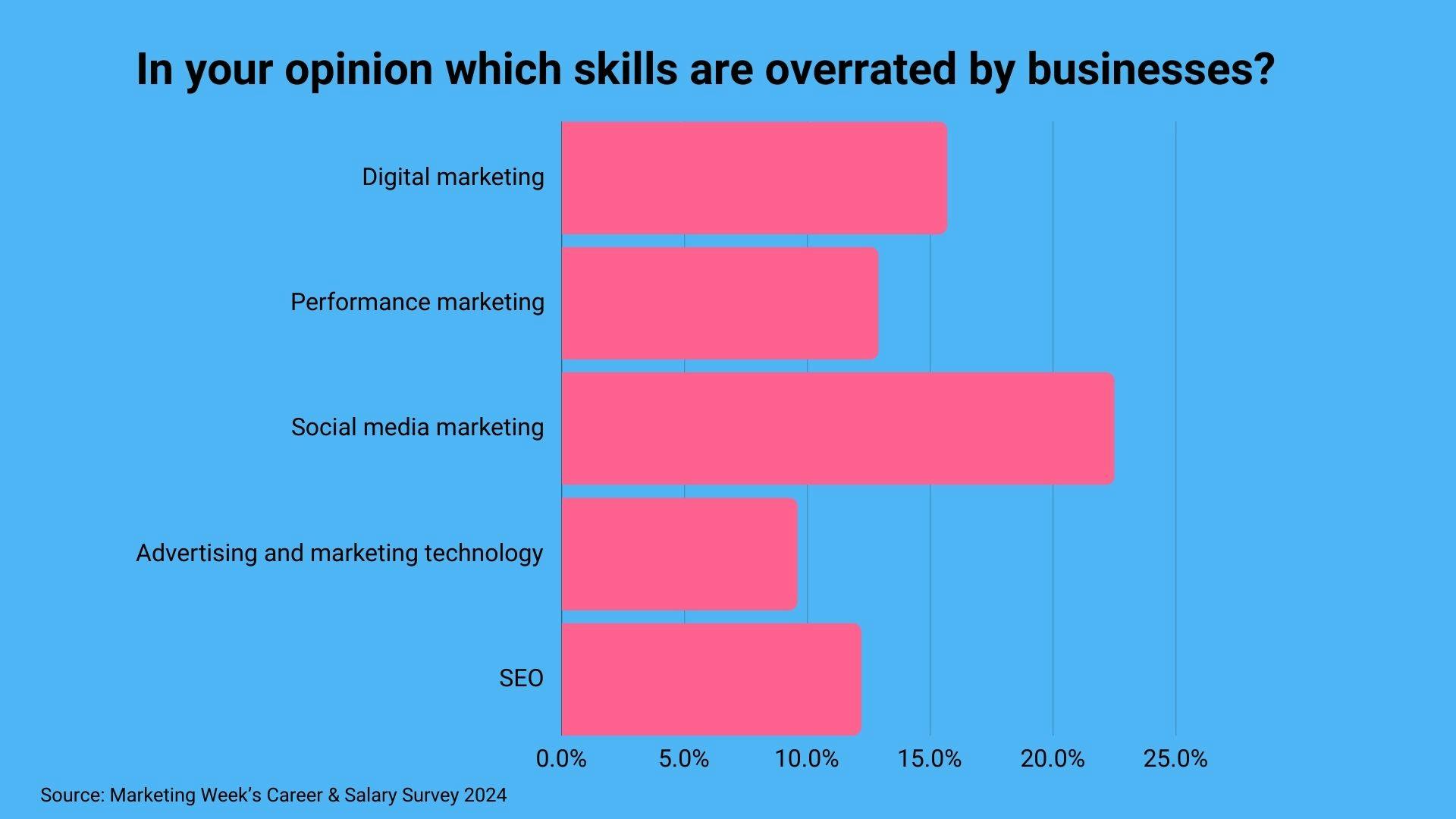 For the second year running, more than a fifth (22.5%) of the 3,000 marketers surveyed say social media is the most overrated skill that businesses look for in a marketer, a slight fall on the 22.9% who said the same in 2023.