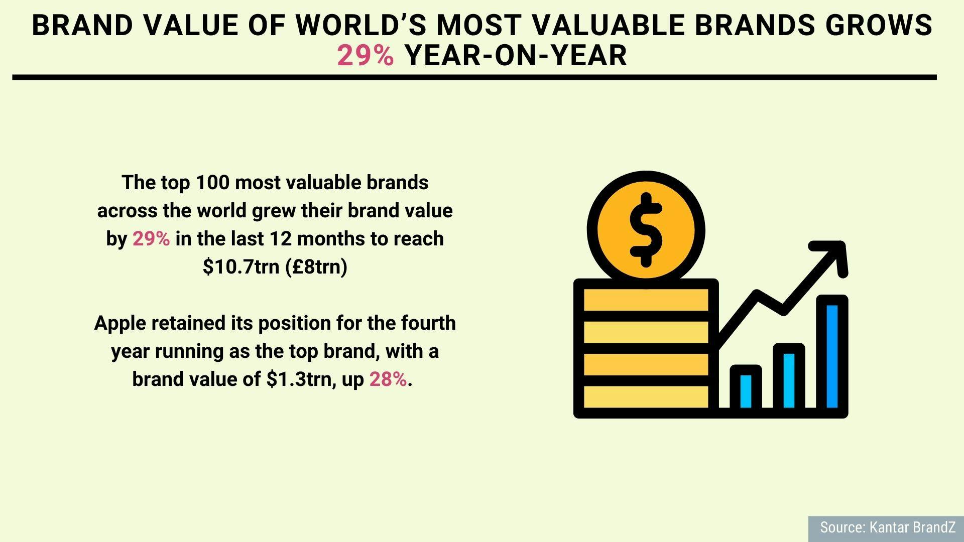 The top 100 most valuable brands across the world grew their brand value by 29% in the last 12 months to reach $10.7trn (£8trn), according to Kantar’s annual BrandZ ranking.