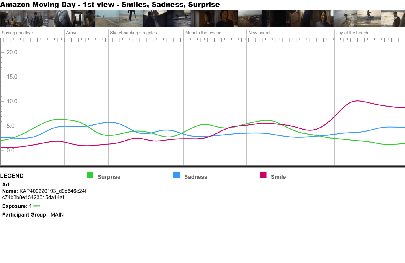 Facial coding technology shows a shift in emotion when the mum shops on Amazon, with smiles becoming more prominent. Eye-tracking data also reveals that the Amazon logo catches viewers’ attention at key moments.