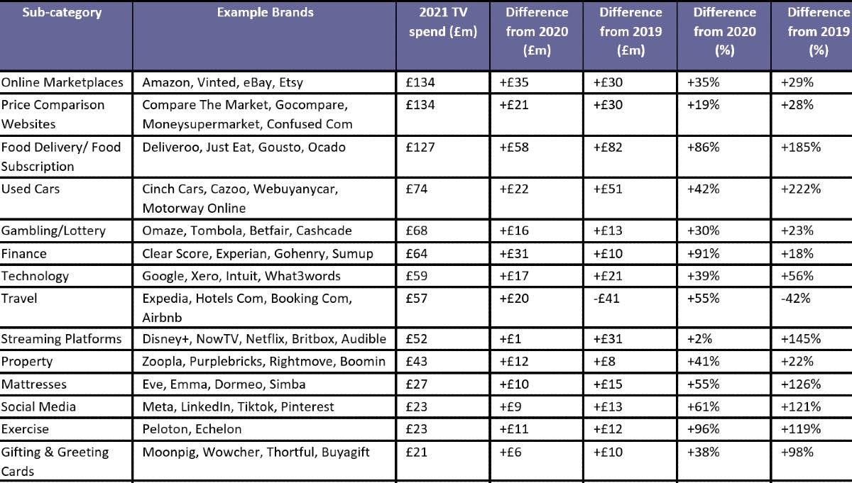 Within the world of online-born businesses, the fastest growing sub-category in 2021 was food delivery. Brands including Just Eat, Uber Eats, Gousto and Hello Fresh contributed towards a total TV spend of £127m, up £58m year on year.